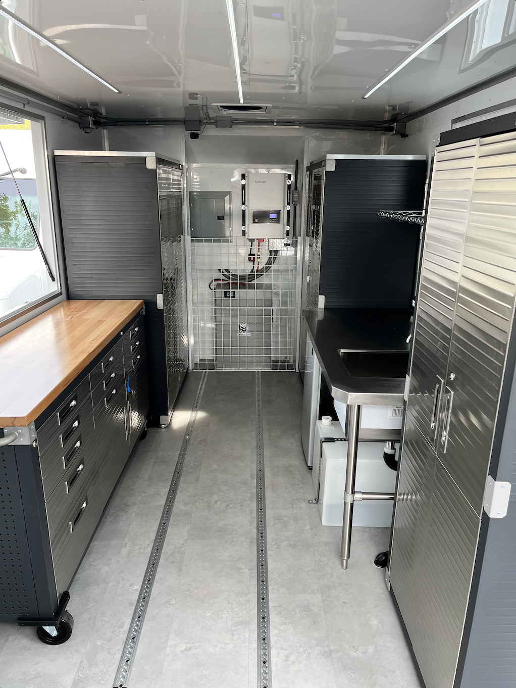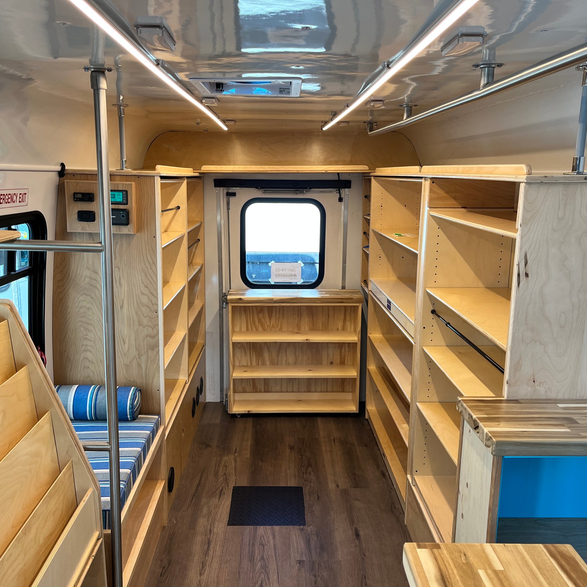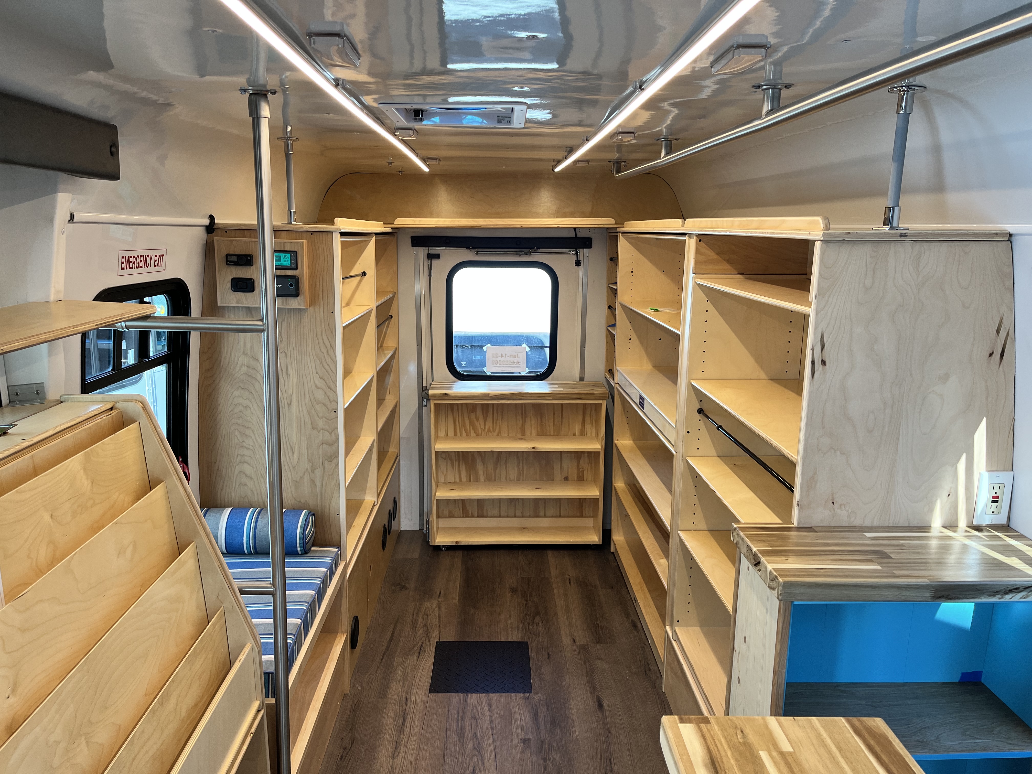 We were approached by the folks at Nimbus Arts to help them create a mobile art studio that they could drive to event spaces as well as bring art classes into the outdoors with ease at parks and wineries. We integrated a solar powered battery system for the vehicle as well as a water system for rinsing brushes and cleaning up after all the fun. This project presented a fun challenge to us to figure out secure storage concepts for things like large easels and chairs that needed to be kept stable and safe during transit.